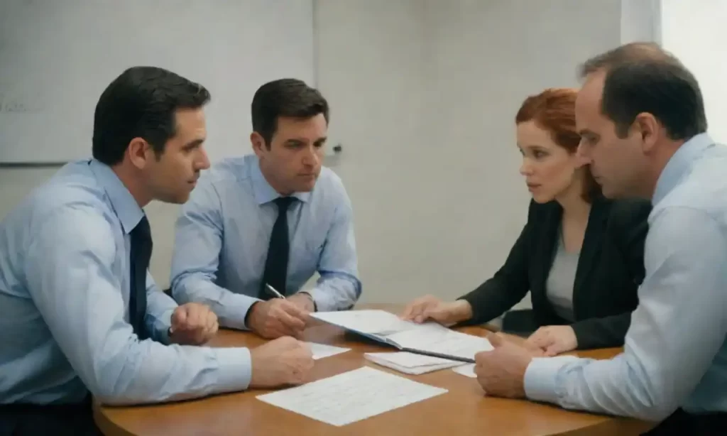 Equipo discutiendo estrategias sobre un pizarrón con gráficos y notas sobre inclusión laboral.