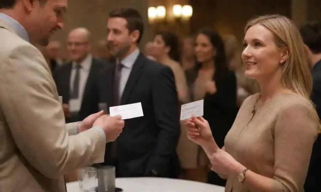 Profesionales intercambiando tarjetas de visita en un evento de networking.