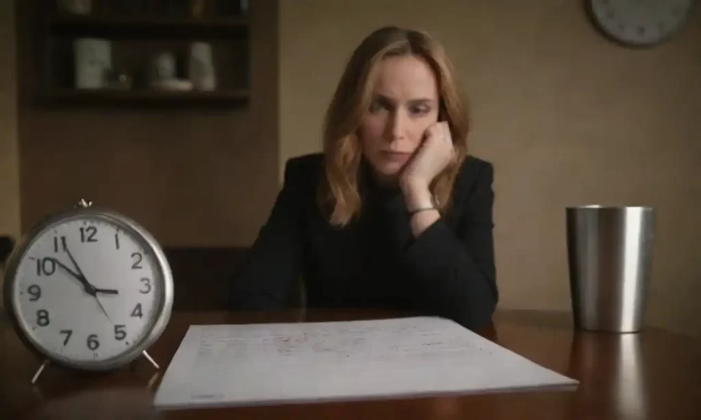 Persona considerando la discusión salarial en una mesa de café con un reloj y calendario.