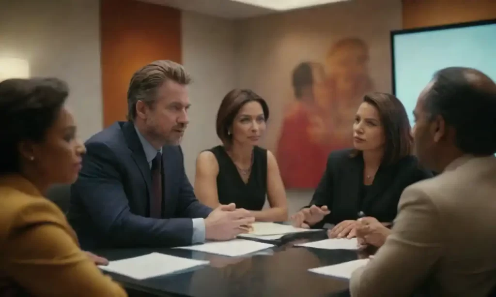 Un equipo diverso que participa en una reunión con diversos iconos culturales en el fondo.
