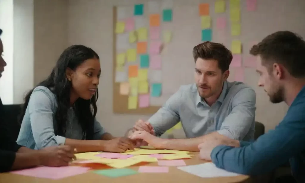 Diversos miembros del equipo colaboran alrededor de una mesa con notas pegajosas y un plan de proyecto.